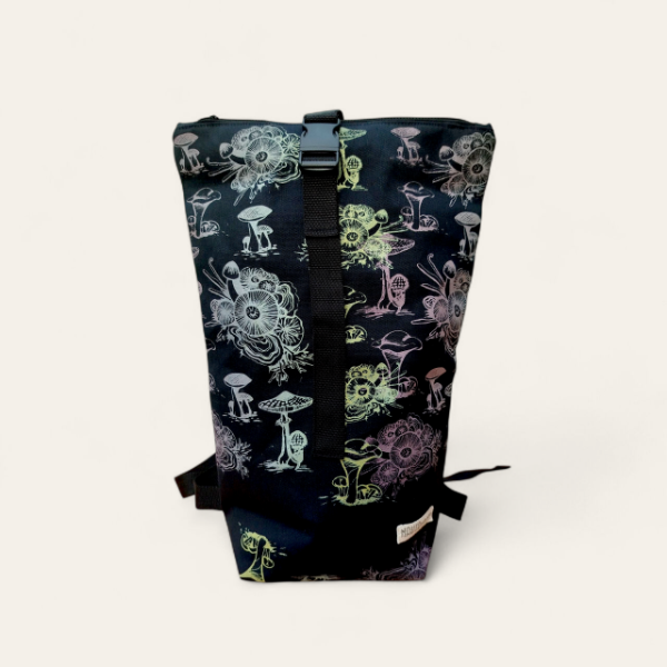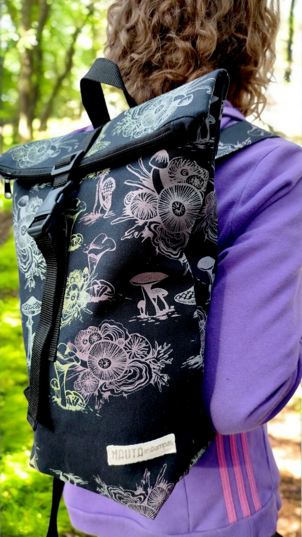 Mochila confeccionada en lona 100 % algodón. Forro sintético impermeable, bolsillo interno y cierre.