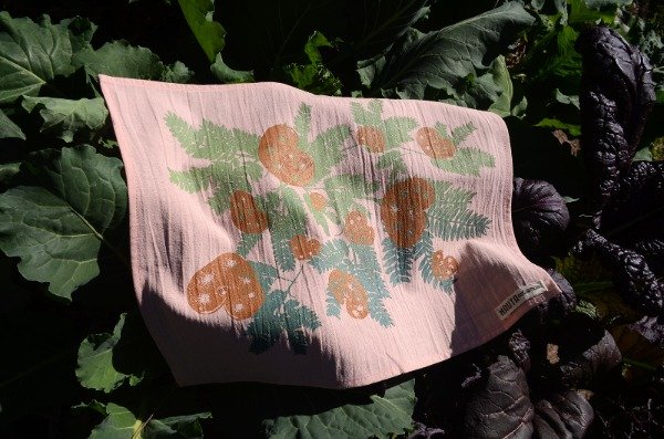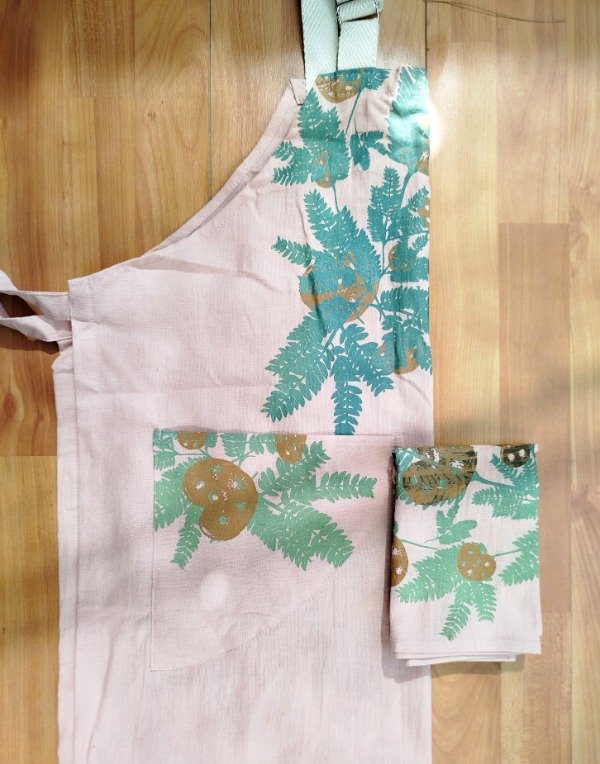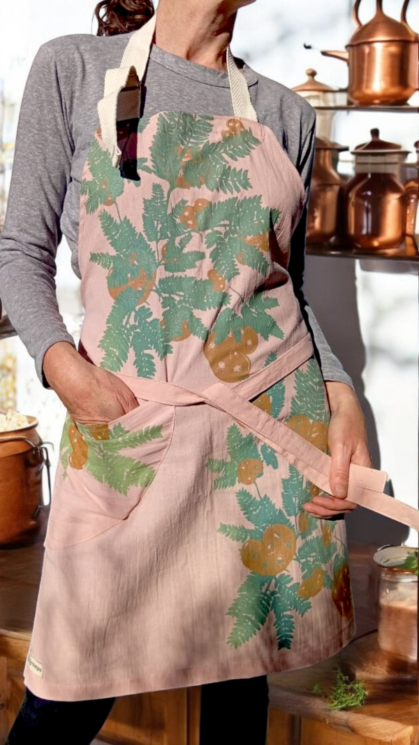 Delantal confeccionado en textil de algodón, estampado mediante serigrafía con tintas al agua.