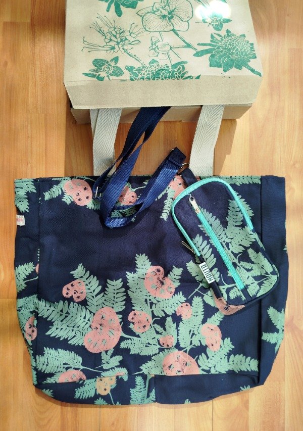 Bolso confeccionado en textiles 100 % algodón (tussor, lienzos y gabardinas), bolsillo interno, broche imán y costuras envivadas. Estampado mediante serigrafía.